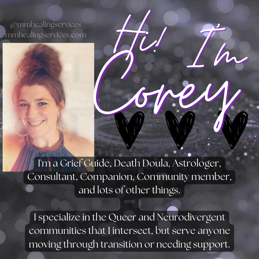 Hi! I’m Corey. I’m a grief guide, death doula, astrologer, consultant, companion, community member, and lots of other things. I specialize in the Queer and Neurodivergent communities that I intersect, but serve anyone moving through transition or needing support.